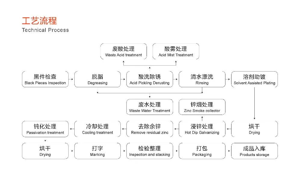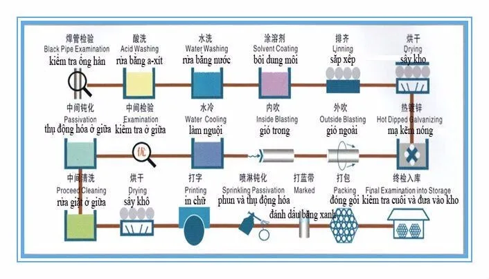 Process: Drying → Zinc hot-dipping → Extracting out→ Outer-blasting →Extracting up →Transverse-move →Inner blasting → water cooling →drying → Passivation → Marking → Blue belt marking → Inspection → Packaging