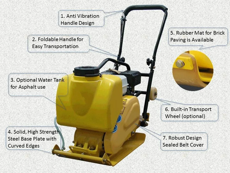 Design for compaction in confined areas of granular soil in narrow trenches, these plates are ideal for curbs, gutters, around tanks, forms, columns, footings, guard railings, drainage ditches, gas and sewer works and building construction.