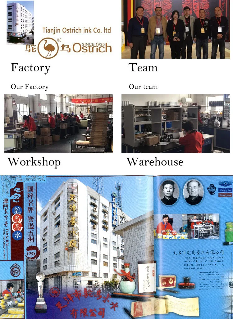 Tianjin Ostrich Ink Co.,Ltd. is the birthplace of the first ink in China, one of the largest factories to produce ink with sale range in many places in China .Tianjin Ostrich Ink Co., Ltd. is leading scientific and technological innovation through mechanism innovation, and in production processes, product quality and new product development, etc., with high R & D capability and strong technical force. Now a new, vigorous and matured enterprise with long history is showing in front of people with dozens of new products in terms of ink for various pens,digital jetting and printing ink for computer and marching toward the world.