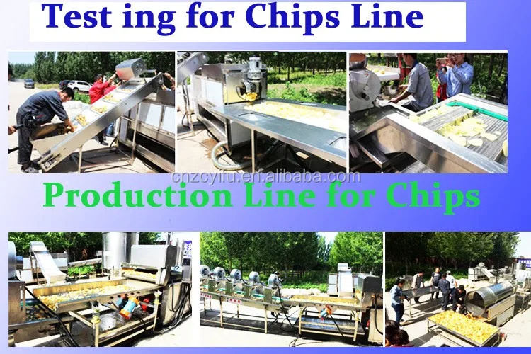 Raw material→conveyor→washing and peeling→picking line→conveyor →cutting→rinsing→blanching→vibrating de-water equipment→drying→frying→vibrating de-oil equipment→cooling line→conveyor→quick freezer→packing