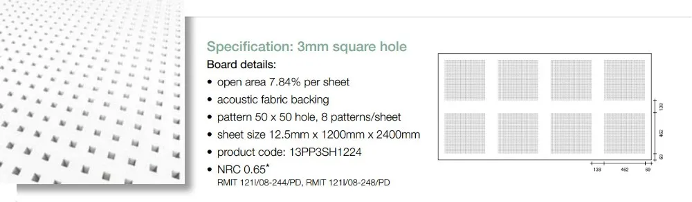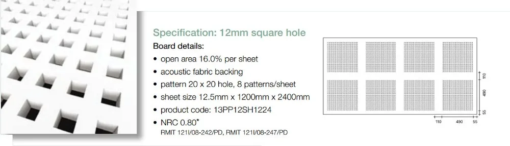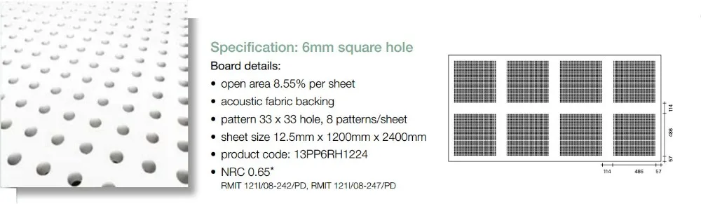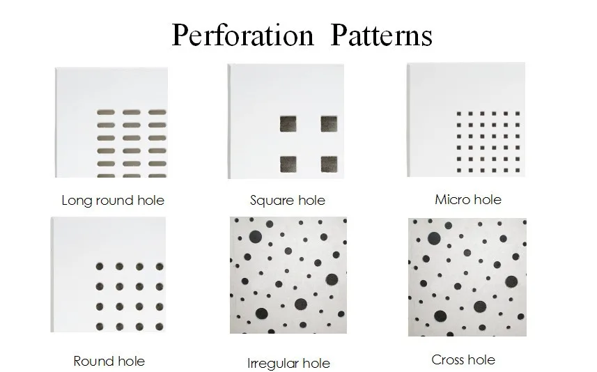 Core material | high grade glass fiber reinforced gypsum board | perforation | Micro hole 3/8.33R Square hole 10/20Q 12/25Q Circle hole 6/25(18)R 8/25R 12/25R Cross hold 8/12/50R Long Round hole 4*14LR Irregular hole (pop hole) 8/15/20R More design can be customized according to you requirements. | |||