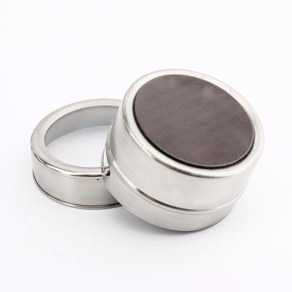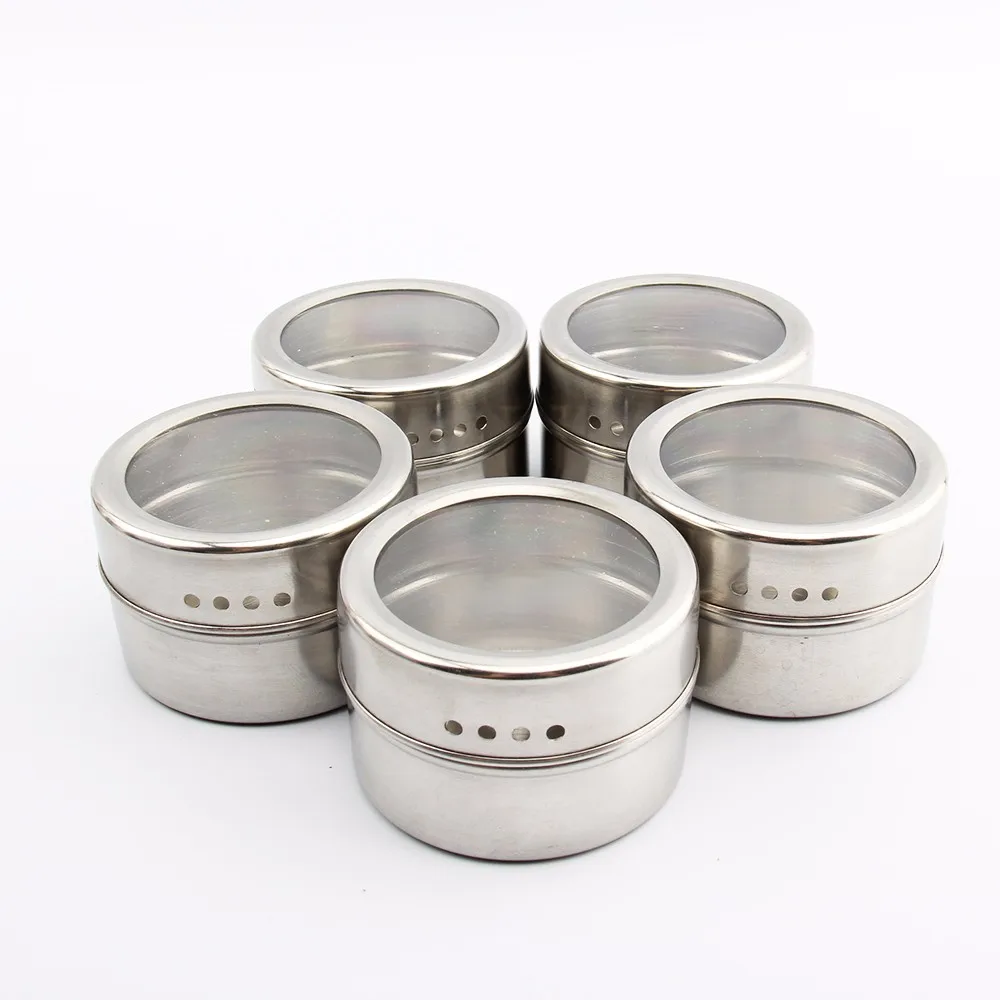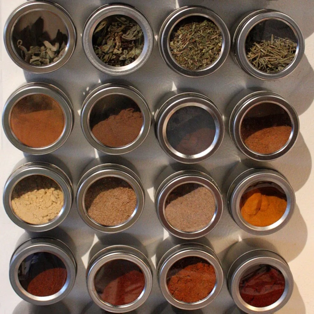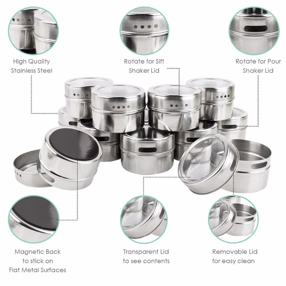 The tins feature clear lids for easy identification of contents,and have convenient sift or pour lids,just turn to shake or pour spice contents out. Also, the lids come off easily for washing and refilling, yet they are tight enough to keep spices from escaping when mounted.