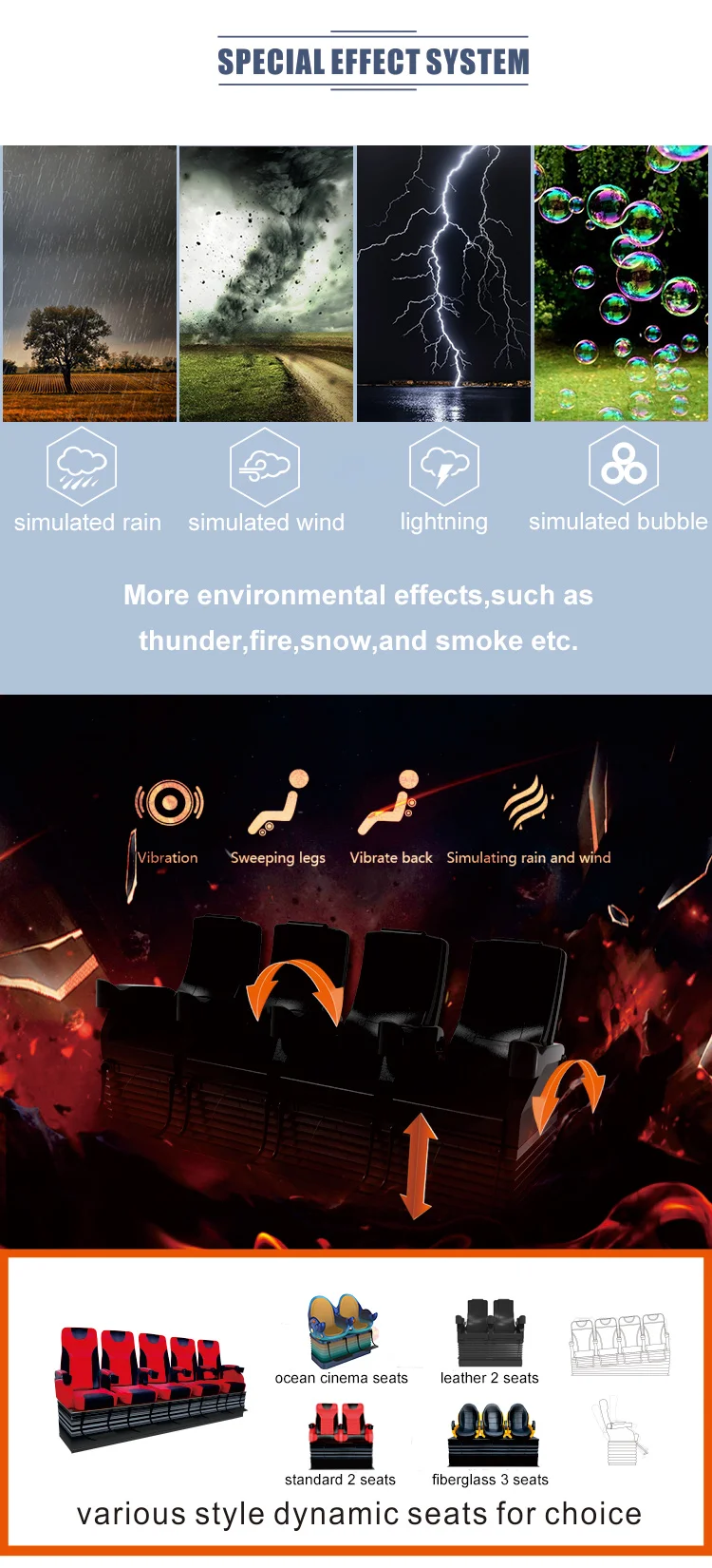 Special effects | Rain,snow,bubble,lighting,wind,fog,smell,fire | |