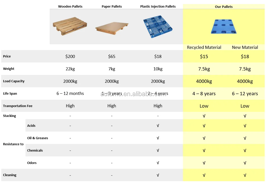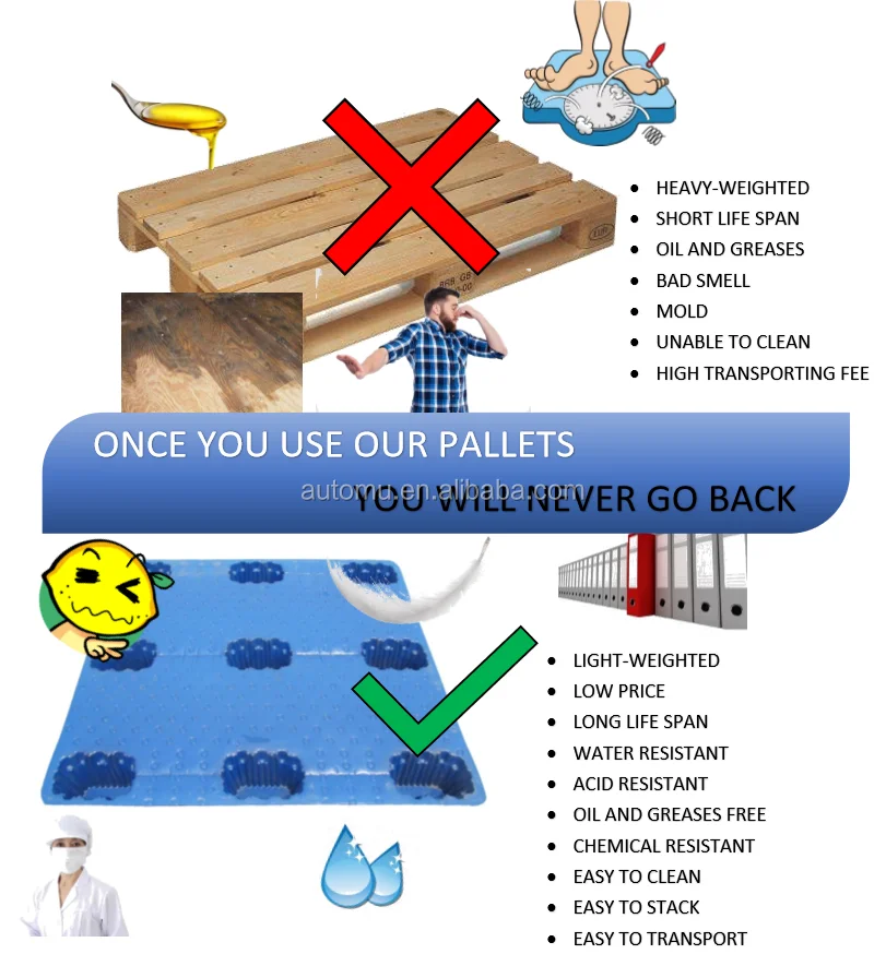 The invention of plastic pallets is the protection of the environment. Instead of traditional wooden pallets which reduce the damage to the forest, it is an inevitable product for the logistics transportation development.