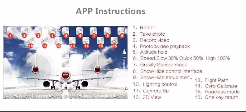 Rising, descending, forward, backward, left turn, right turn, left and right side, 360 degrees flipping, air pressure hover, one key takeoff, one key landing, headless mode, one key return