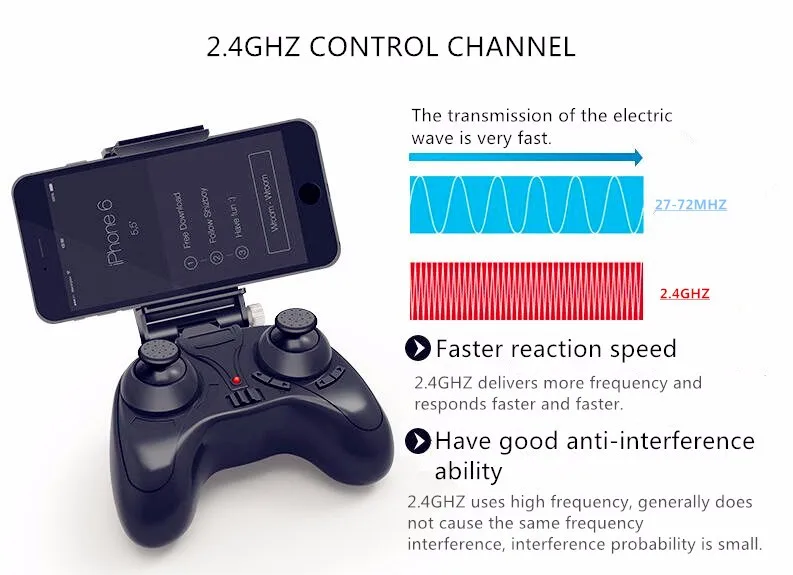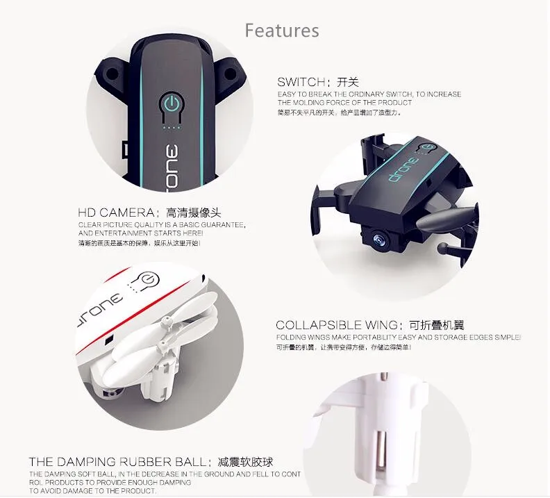 Standard +APP control, voice control, track flight, gravity induction, photo taking, video capture and WIFI video transmission.