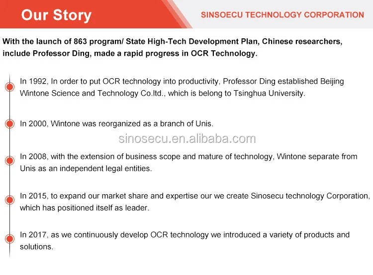 Sinosecu Passport Reader is a multi-purpose document scanner based on high-precision OCR algorithm. It consists of a unique hardware device and advanced OCR SDK/API. It can automatically capture data from ICAO compliant and Non-ICAO travel documents, including passport, e-passport, visa, ID card and driver license. It provides and ideal solution for fast identity verification.