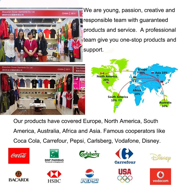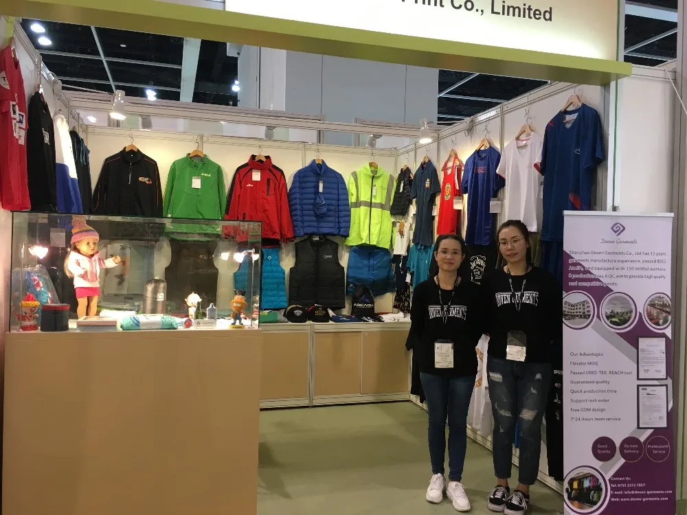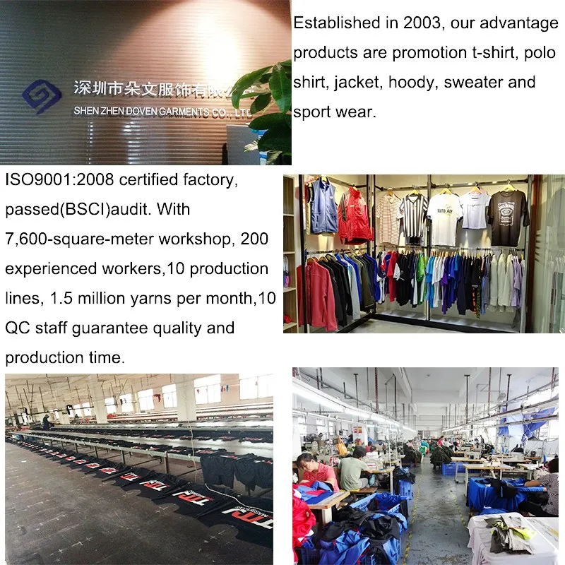 Shenzhen Doven Garments Co., Ltd has 15 years garments manufacture experience, passed BSCI Audit, equipped with 120 skillful workers, 8 production lines, 6 QC, aim to provide high quality and competitive goods.