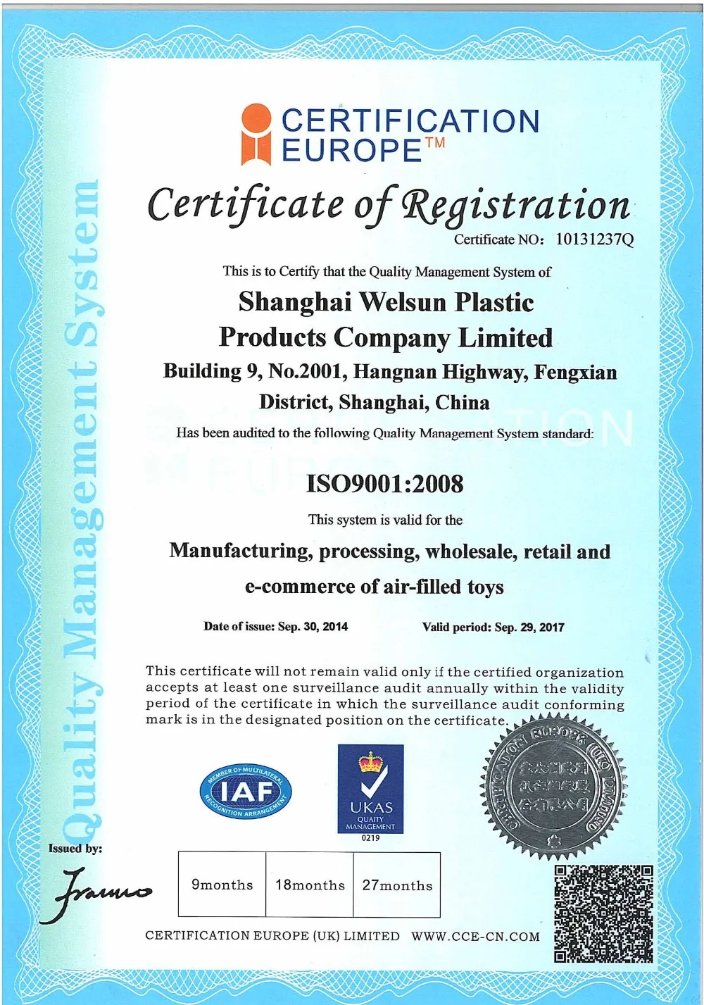 Our factory are qualified for the ISO9001:2000 international quality management system certificate. Our factory have BSCI. All of the raw materials that we adopted comply with European EN71, American ASTM standard and NON PHTHALATE (6P) standard.