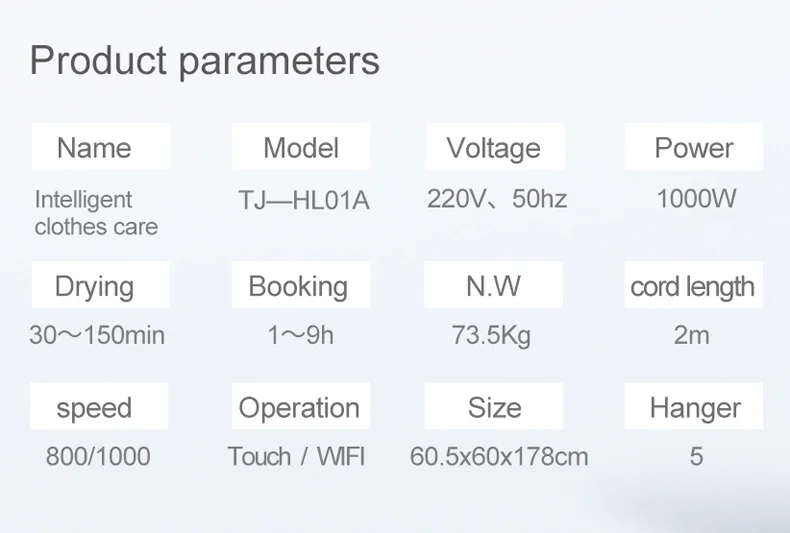 TJ-HL01A | Input Vol.: | AC 110V / AC 220V 50HZ | Drying/Steam clean/ UV sterilization/ Fold remove/Vibration/Deodorization | |