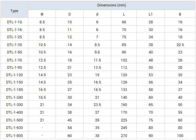 (1) Cable lugs are suitable for the connection of copper conductors (section l.5-1000mm2) in power cable