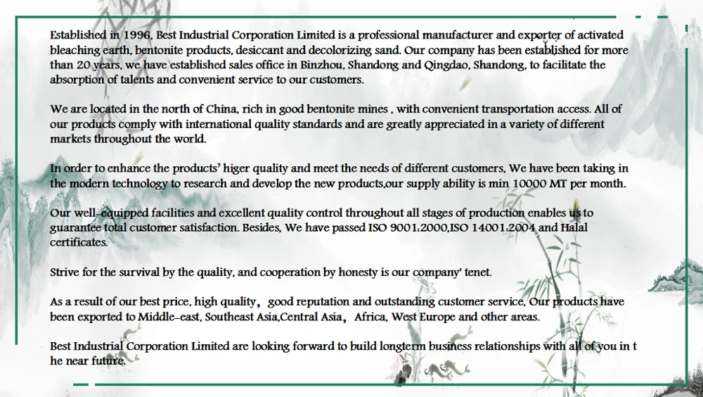 Activited bleaching earth is powder clay,made from bentonite material, also called activited clay,activited fuller earth is a fine,light color powder with a highly porous inner structure and a numbers of acid sites on its surface.