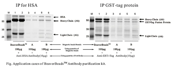 BeaverBeadsTM Protein A / G Matrix beads immunoprecipitation product enables Protein A / G to cover superparamagnetic microspheres with high density by using Beaver biological nano- technology. Comparing to similar products currently on the international immunomagnetic beads market, it has more antibody binding points, less usage of beads and low binding rate with other protein, so it makes immunoprecipitation experiments more efficient. Each milliliter immunoprecipitation beads can combine with human IgG for more than 300μg, and a single precipitation reaction only need 25μL beads. The super-large specific surface area provided by the micrometer beads can significantly reduce the equilibrium time required for adsorption of antibody and antigen. The antibody adsorption process can be completed within 15 min and the antigen precipitation process is completed within 30 min. Short operating time can avoid target protein hydrolysis, ensuring the activity of the target protein and integrity of protein complex.