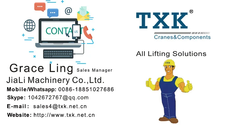 We Jiangsu Jiali Machinery , covers a total area of 100000 sq.m, located in Jiangsu China. We are a professional manufacturer of 'TXK' brand electric chain hoist, wire rope hoist, manual hoist, cranes and crane components, also a trustworthy supplier of related lifting equipment. We obtained CE, SGS, ISO certificates for our products.