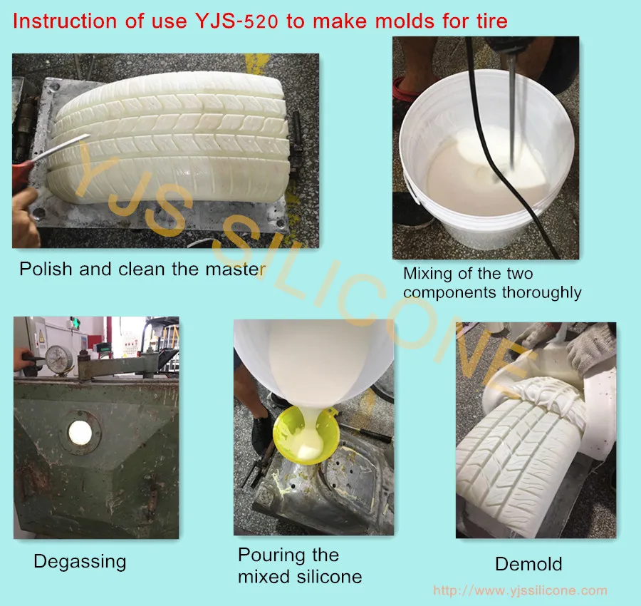 Hardness 20 shore a rtv 2 liquid condensation cure silicone rubber for tire molds making YJS-520 is used for making molds of concrete stone,GRC, gypsum decoration, plaster ornaments,fiberglass products, polyester decoration, unsaturated resin crafts, polyresin crafts, polyurethane, bronze, wax, candle,and similar products .