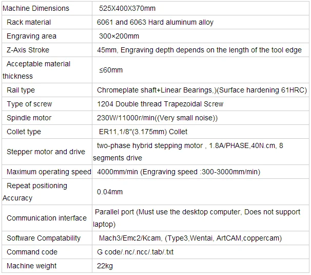 Technical detailes for this 3 Axis Mini CNC 3040 CNC Wood Engraving Machine
