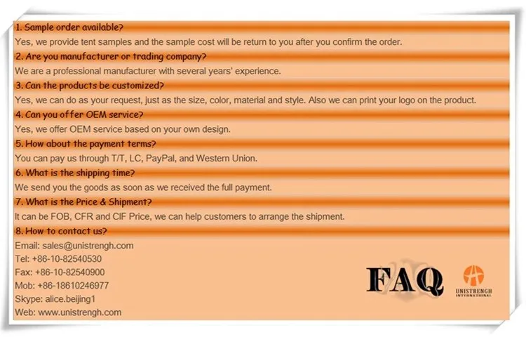 Outside tent | 200gsm cotton canvas, PU coating, water proof, mildew resistant. | ||||