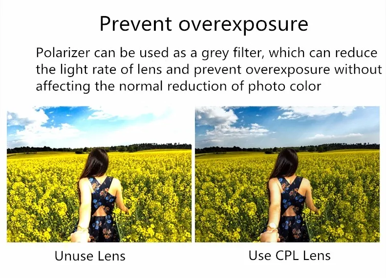 CPL LENS | CPL can eliminate stray light,to prevent excessive exposure, increase color concentration, restore the true colors of the camera, to make the scene more natural color. | ||||