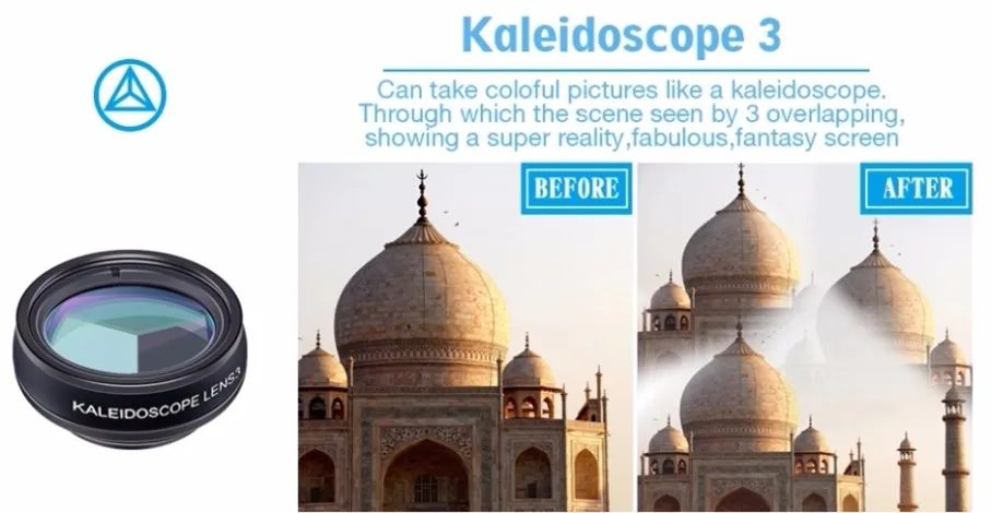 KALEIDOSCOPE LENS | Can take colorful pictures like a kaleidoscope, through which the scene seen by the number of overlapping, showing a super Reality, fabulous fantasy screen. There are 3 points filter available to meet your different need. | ||||
