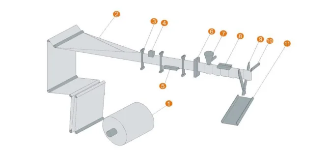 2.Pouch forming | 4.photocell | 7. open and filling | 9.cutting | 11. outlet |