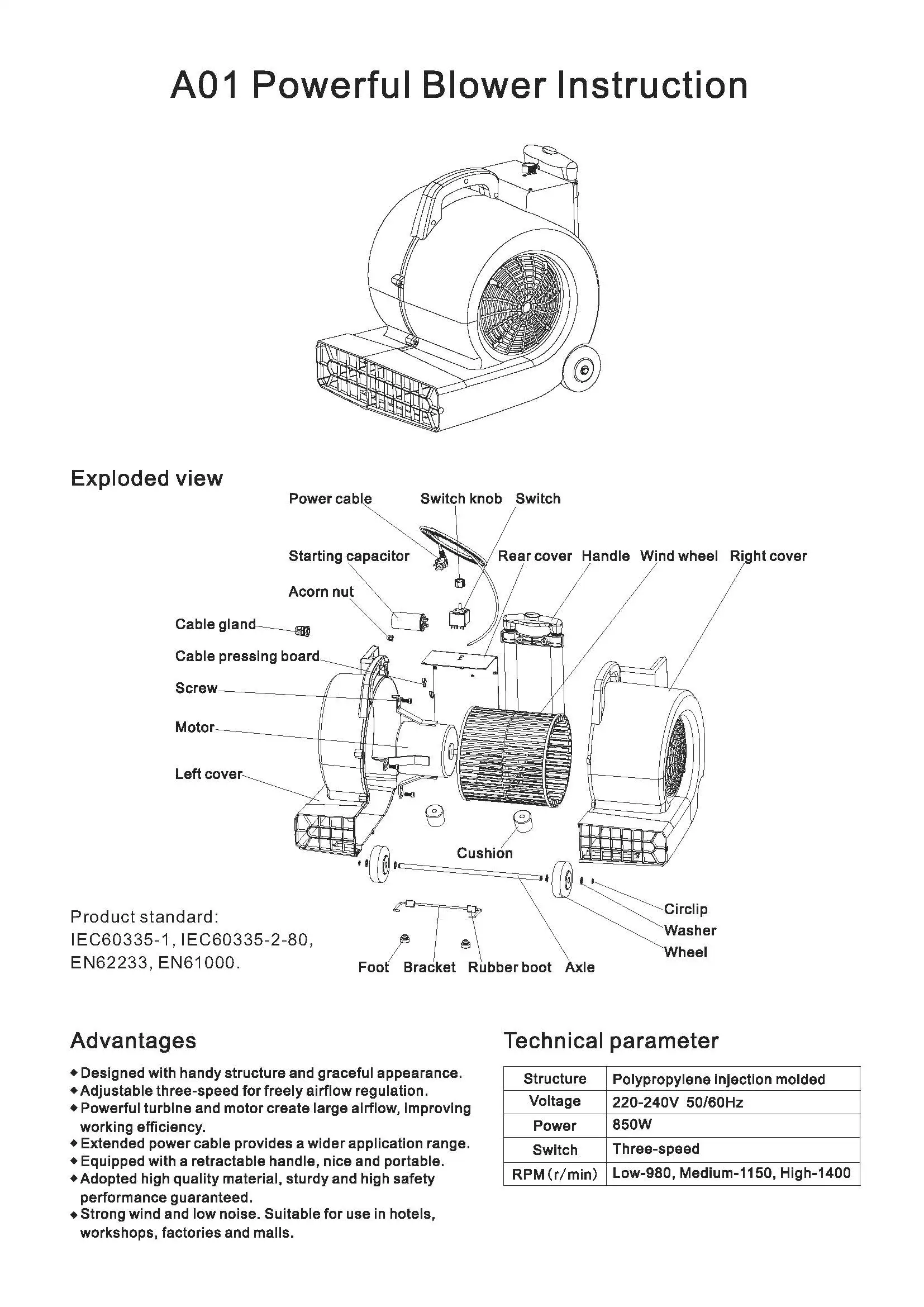 7) With stronger wind power and lower noise, the machine is applicable for hotels, factories, warehouses and various damp sites.