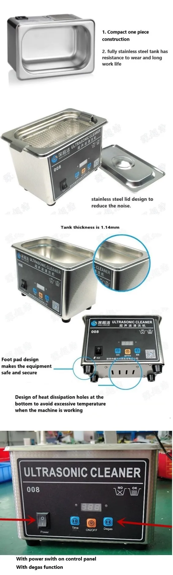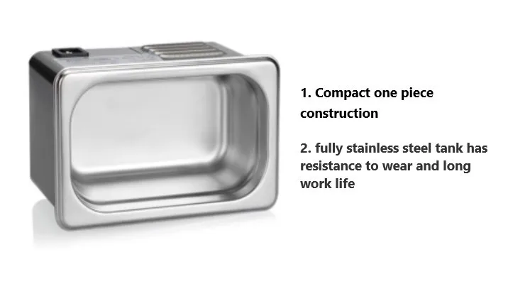 2) Compact one piece construction fully stainless steel tank has resistance to wear and long work life, stainless steel lid design to reduce the noise.