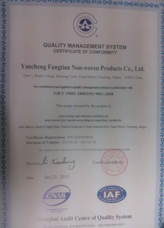 We established in 2000, depending on technical advantages, powerful manufacturing experience on dust mask and strict quality control system on dust mask, we get approval of ISO9001, CE Certificate , BSCI ,and N95 Certificate.