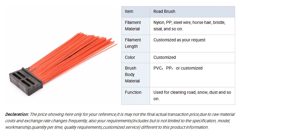 Road sweeping brush main products: the wire disc brush, square brush, wafer brush, round brush, intermediate roller brush, side brush, wire roller brush, snow brush, multipurpose ice-breaking snow brush and more than 300 varieties. Our products are applicable to all types of domestic, import road sweeper, snowplow, guardrail cleaning vehicle, street, airport runway, highway, port and road construction and they are ideal for sweeping snow.