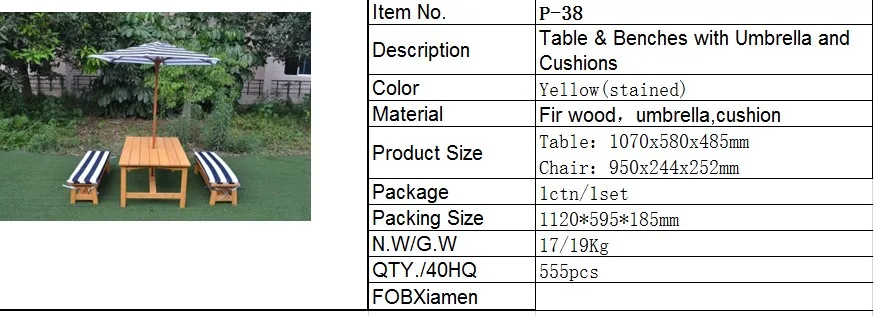 Materials | High quality fir wood, 100% solid wood | an umbrella | two cushions | |