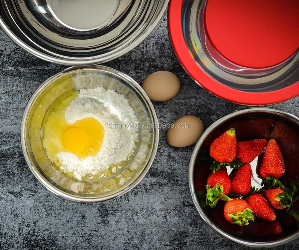 Made with durable stainless steel that matt finish exterior & mirrored finish inside. The non-skid silicone bottom, inside qt & liter measurments marked and stackable easily, which make them the perfect mixing bowls.