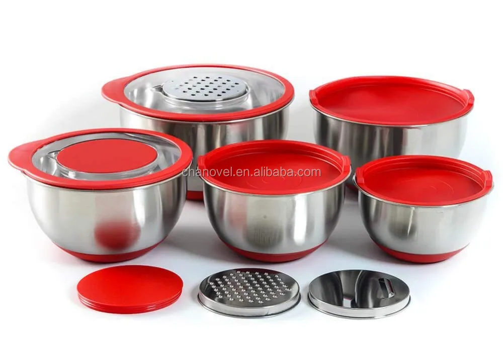 Includes 5 different size of bowls: 1.5QT, 2QT, 2.5 QT, 3.5QT, 4.5QT, with 3 regular lids and 2 transparent lids & 3 graters. Use them for all the baking and cooking needs.