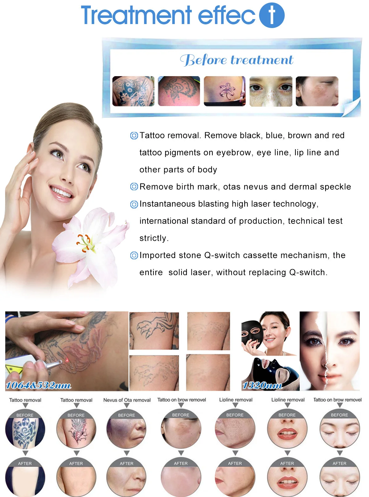 | Application | tattoo removal, eyebrow embroidery removal, eyeline removal, freckle removal, skin rejuvenation, lipline removal pigment treatment, whitening |