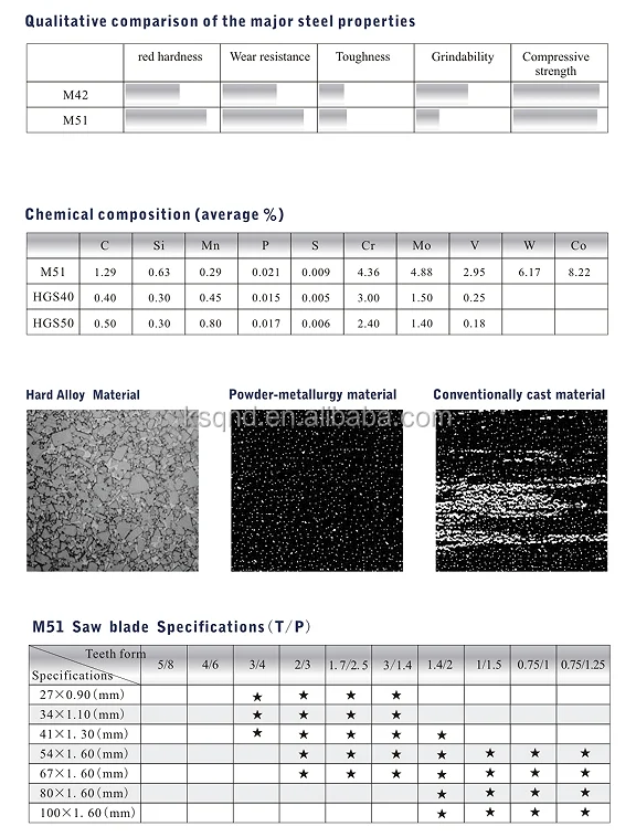 For the Bi-metal saw,the teeth are welded using cobalt-alloy with hardness reaching HRC69-70.M51 Tooth and Substrate jointing by laser after separately special spring steel heat treatment.Tooth’s rigidity and Substrate’s intension exert their use to the extreme.This saw is suitable for cutting Heat-resisting alloyLow-carbon stee\\Medium carbon steel、High-carbon steel and Non-ferrous metal.Which results in cost saving and improves cutting efficiency.