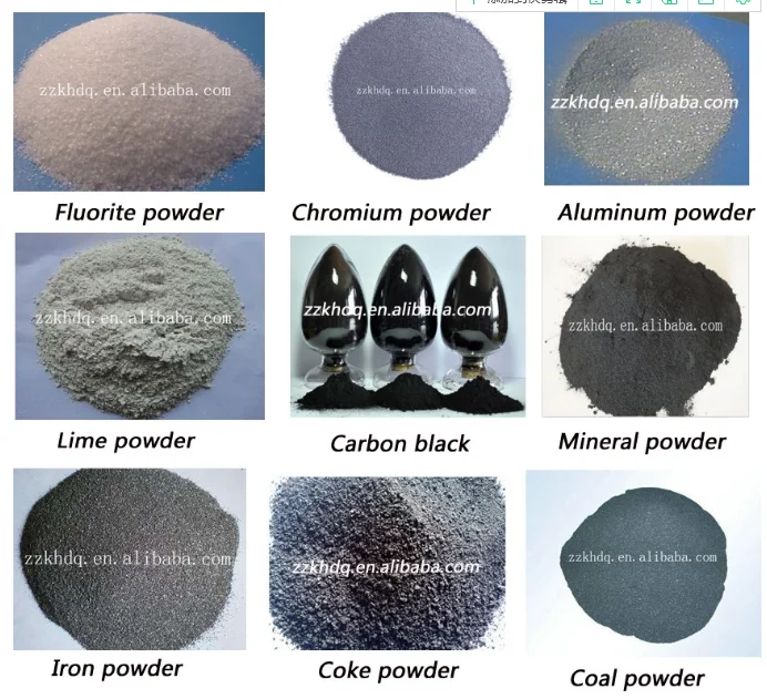 coal fines, coke fines, charcoal powder, carbon black, iron ore fines, mineral powder, metal dust, cast iron dust, mill scale, manganese ore fines, fluorite powder, gypsum powder,ferrosilicon powder, and phospho gypsum powder, nickel alloy, blast furnace ash, converter dust, coal gangue, Kaolin clay, MgO, NPK, graphite, oil shale, potash fertilizer, urea fertilizer, sea sand powder etc
