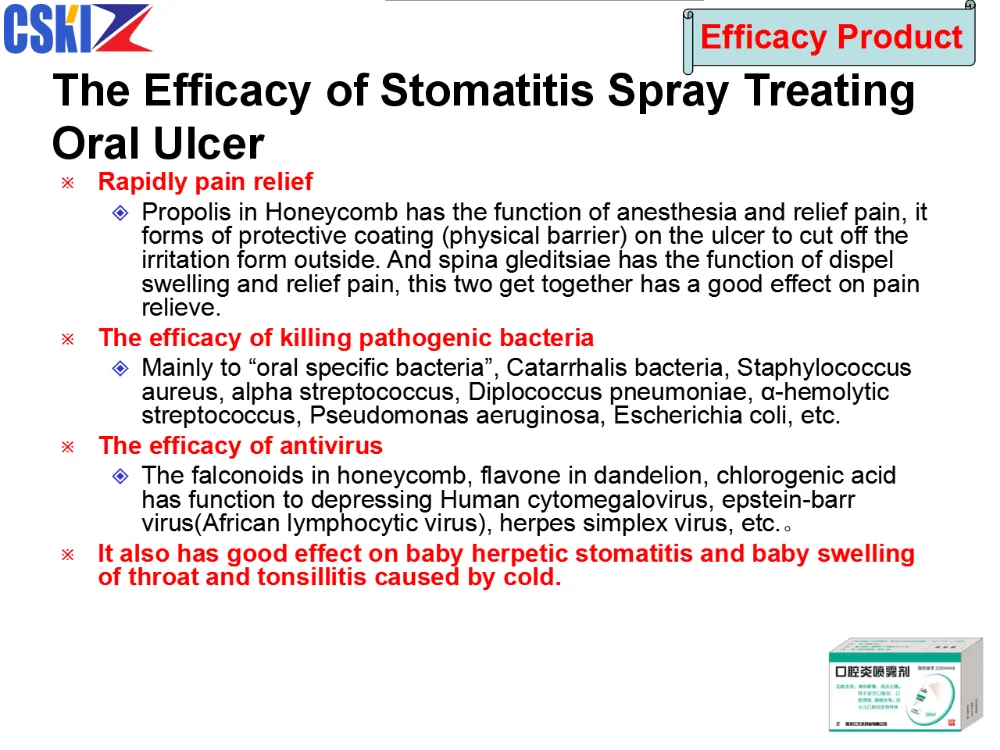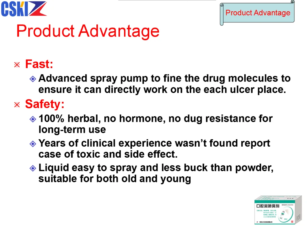 Features: 100% herbal.Best sales drug for oral ulcer in China. Advanced spray pump to fine the drug molecules to ensure it can work on the each ulcer place. Especially good for kids.