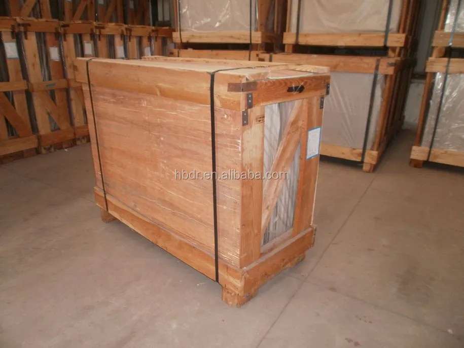 Wooden crates, with papers or powder between two pieces. And plastic film protects glass inside crates.