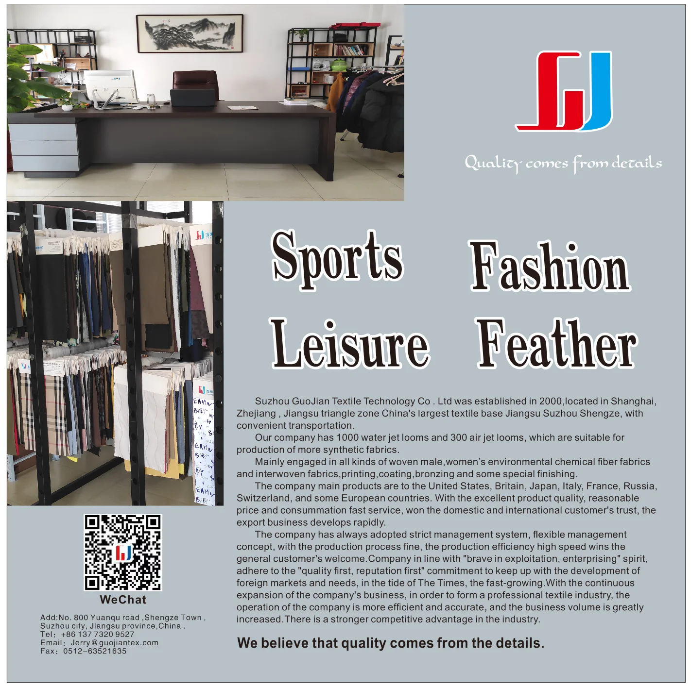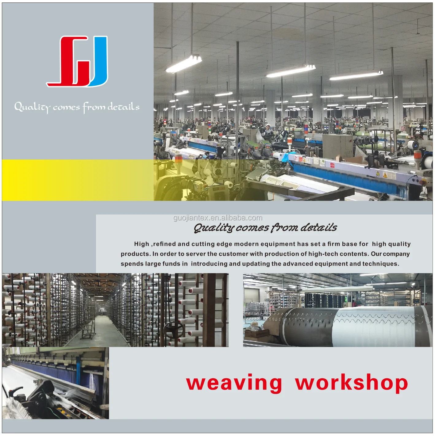 Suzhou GuoJian Textile Technology Co . Ltd was established in 2000,located in Shanghai, Zhejiang , Jiangsu triangle zone China's largest textile base Jiangsu Suzhou Shengze, with convenient transportation.