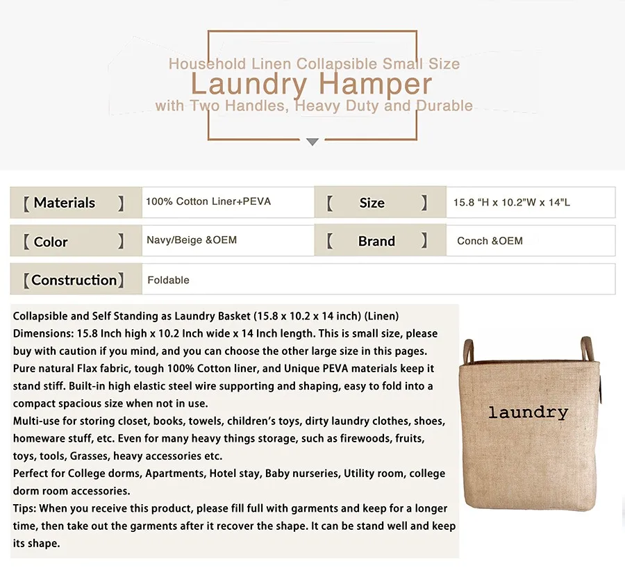 Pure natural Flax fabric, tough 100% Cotton liner, and Unique PEVA materials keep it stand stiff. Built-in high elastic steel wire supporting and shaping, easy to fold into a compact spacious size when not in use.