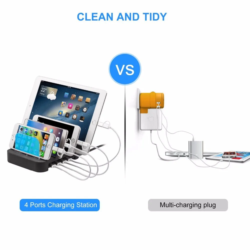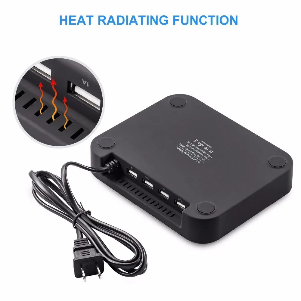 3).4 powered USB ports (5V-4.8A max): simply connect your own charging cable and this powerful charging station will charge up to 4 devices. With smart IC installed, each port intelligently identifies your device and seeks maximize its charge speed. Delivering a steady and safe charge.