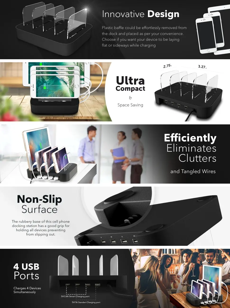 2).Innovative design: the world's 1st charging station that baffles and base can be separated. You can decide which baffle left then you have enough space to fiddle with the posture of your devices, lying flat or sideways to charge.