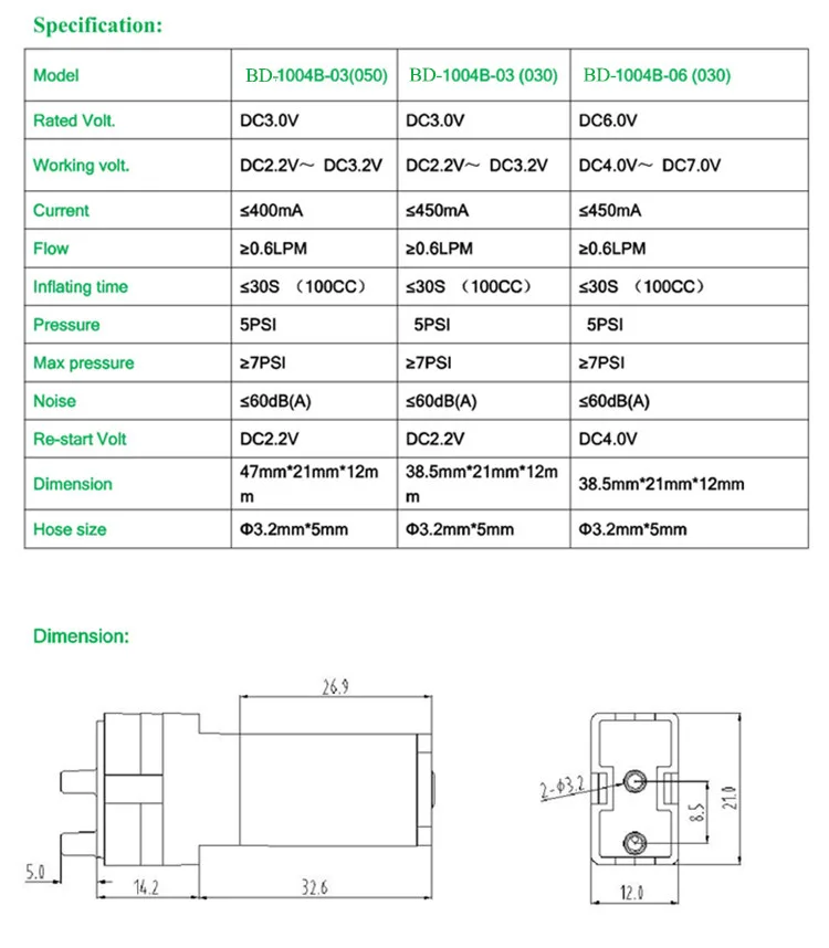 BD1004B SMALL DIAPHRAGM AIR&VACUUM& LIQUID PUMP has the advantages of compact structure, no maintenance, no oil, low power consumption etc. Mainly used in electronic sphygmomanometer, pneumatic tourniquet products, massage and healthcare articles, industrial electrical appliances, medical instruments and small sprayer fields.