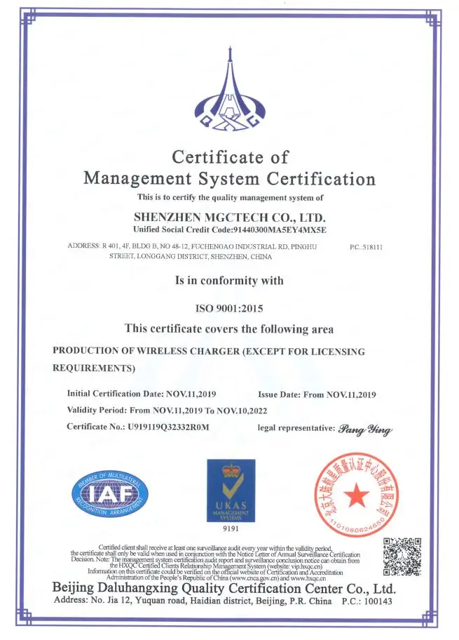 Shenzhen Mgctech Co., Ltd is a world-leading provider of wireless charging solutions, with the principle of prudent Operation, sustainable Innovation and open Cooperation. Focusing on the application of wireless charging, we set up strategic partnership of cooperation with the global top-ranking enterprises in various industries and fields, and maintain close contact with first class scientific research institutions and WPC. We offer competitive solutions, products and services of wireless charging to wireless Smart Home enterprises, restaurant & hotel chains, intuition and End-users. We can provide full-service for wireless charging products from software customization, hardware development, mold design, injection to product assembly. Our business has been around the world for more than 70 countries and regions.