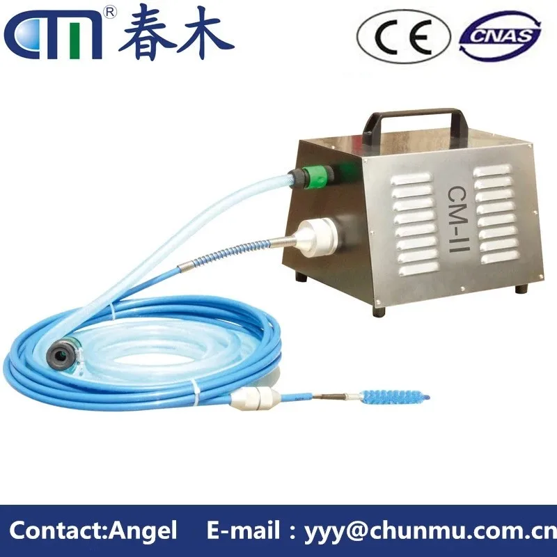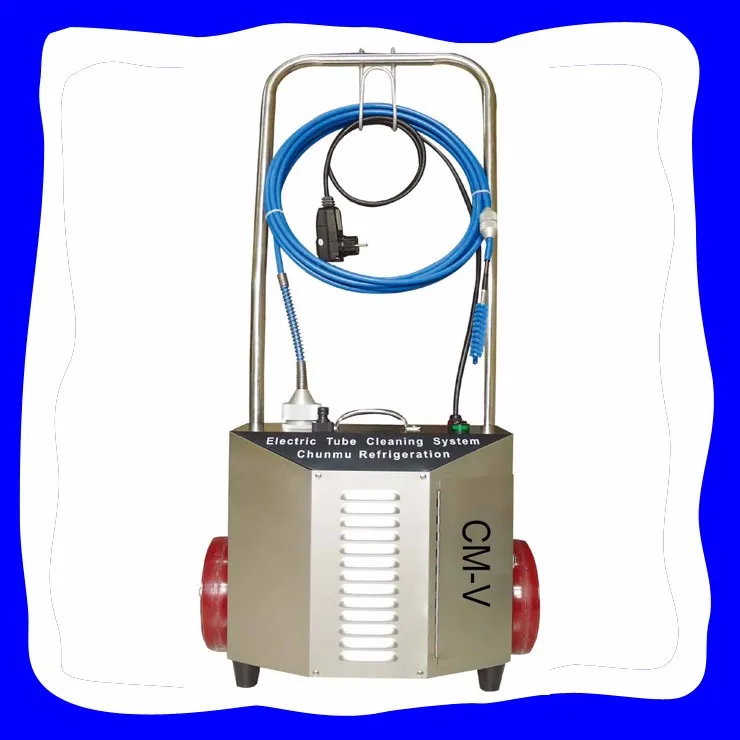 The CM-V tube cleaner for central air conditioner of Carrier ,York,Trane etc uses a cleaning tool mounted to the tip of a flexible shaft, which is available in different lengths and diameters to fit the size of the tube to be cleaned. As the shaft rotates inside its watertight nylon casing,the unit feeds water through the casing to the cleaning tool. A foot switch controls shaft rotation and water flow.While the operator feeds the rotating shaft assembly through the tube, the water flow flushes out deposits as they are loosened.