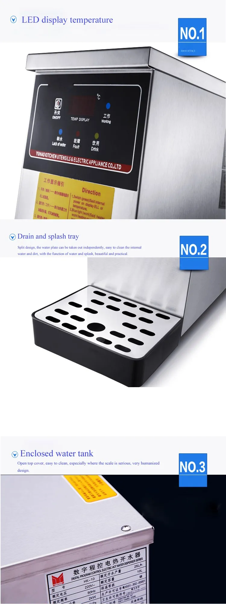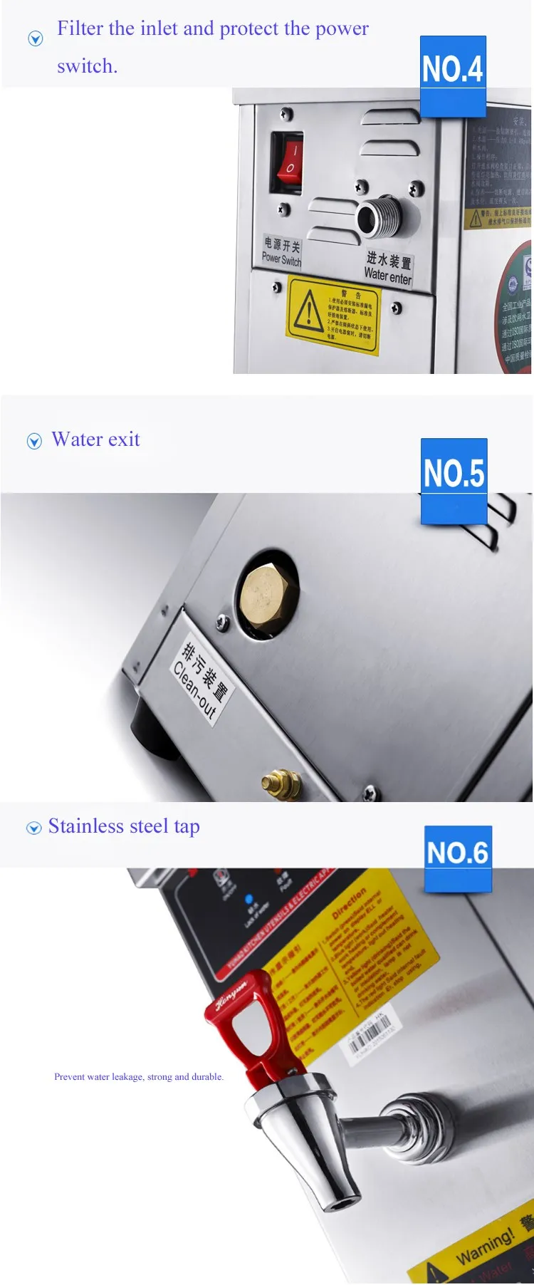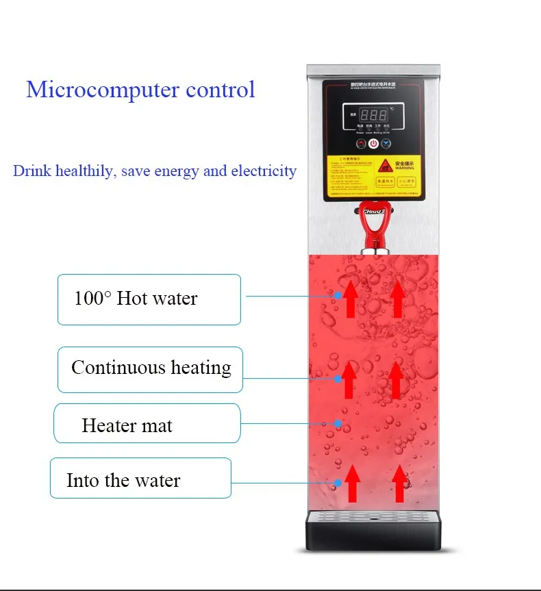 2.Core technology - microcomputer intelligent control energy saving, water level difference step heating, top high temperature water output, thermal insulation boiling water temperature.\t\t\t\t