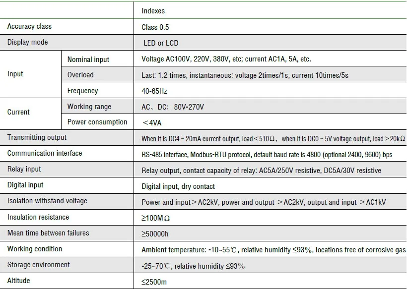 Detailed technical specifications refer to the technical indexes of digital display meter.