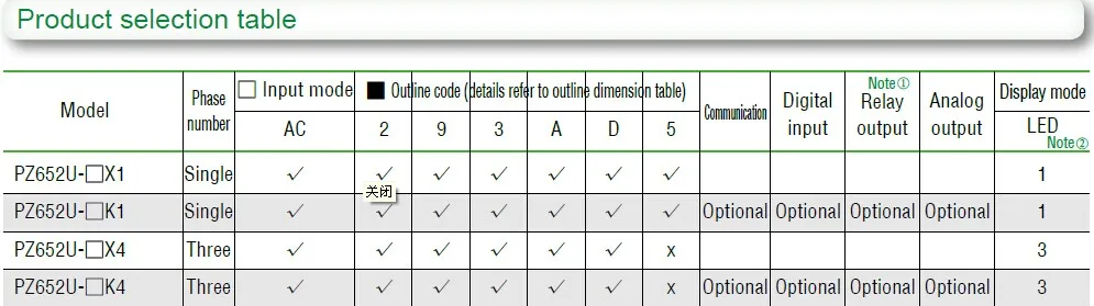 2) Number in table cell of LED column represents the row number of nixie tube, such as “1” means that the corresponding model of meter has 1-row digital display function, “3” means that the corresponding model of meter has 3-row digital display function.