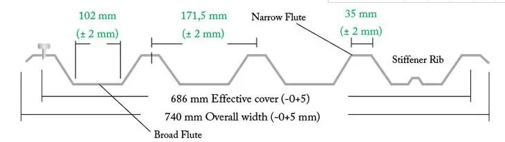 Trimflute profile is a square fluted profile with an effective covering width of 686 mm, designed for use as side cladding or roofing material in commercial, industrial and residential buildings. The name IBR is abbreviated from “Inverted Box Rib” and has become a household name in the South African building industry. The deep, broad flute design offers excellent drainage characteristics combined with optimum weight versus load/span capabilities. IBR can be factory cranked, curved and bullnosed to various radii depending on customer’s requirements.
