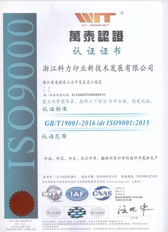 In 2003,the company’s products have passed ASTM D-4236 and EN71-3 testing;In 2000, the company passed ISO9001 that was the first one in seal industry; In 2010,the company passed ISO9001:2008 &ISO14001:2004 that was the first one in seal industry; In 2014,the company passed ISO9001:2015; We set up Quzhou city stamp technology R&D center that was only one major in stamp technology R&D center in China mainland.
