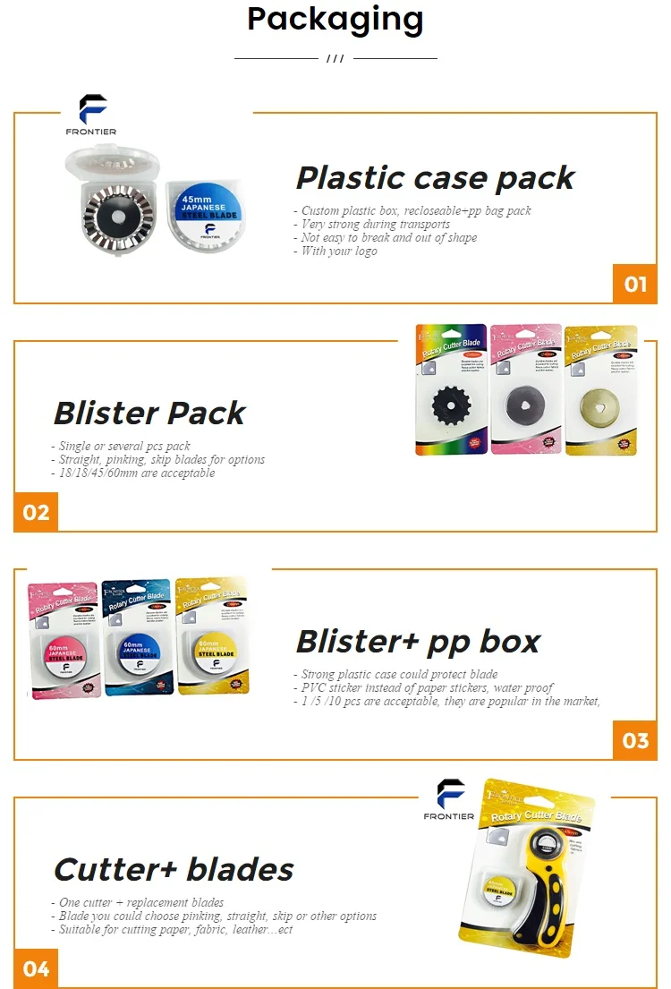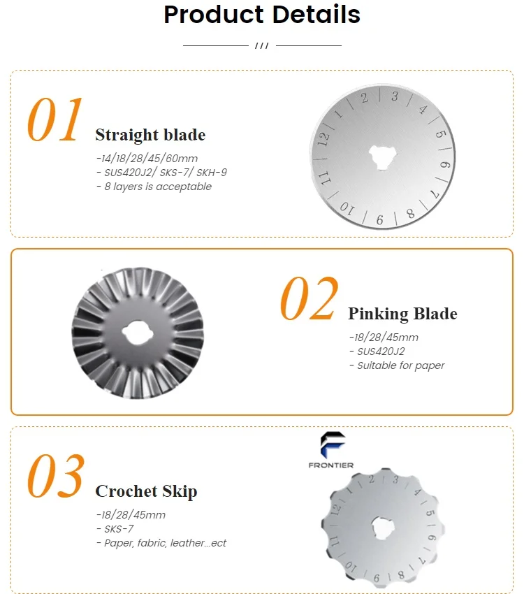 FRONTIER is establised in 1990, work shop more than 8,000 sqm, 2 offices and one shop in the international material zone, we are specialized in designing and manufacturing for Rotary blades, carbide blades, ceramic blades, lawn mower blades, folding knife series, hobby knives series, multi-function knives.