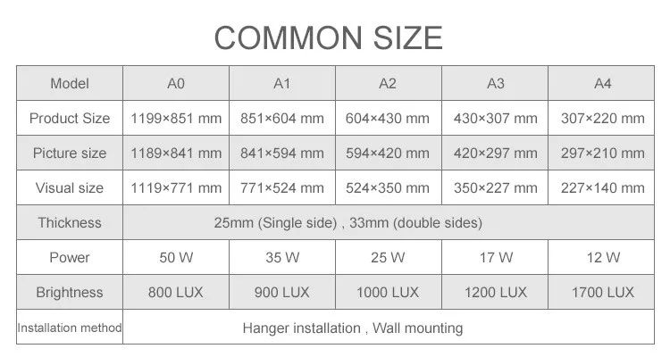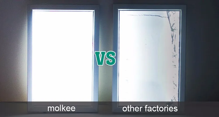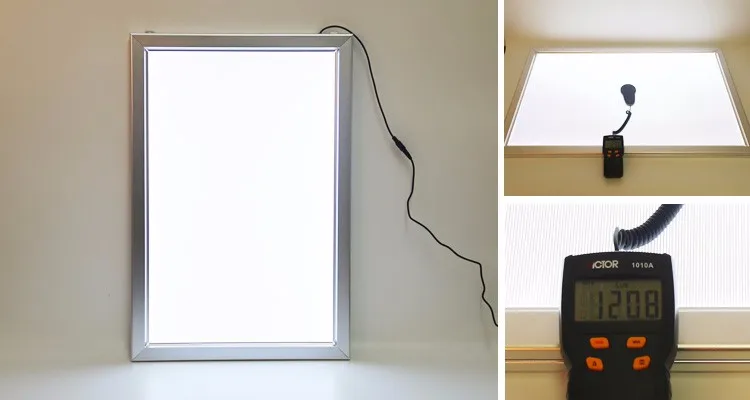 Using 0.2W/ high power LED lamp, the backlight of A3 size center is more than 1200LUX, and the light guide plate uses 4MM laser to engrave the special light guide plate of ultra thin light box, and the backlight is more uniform, without dark area.
